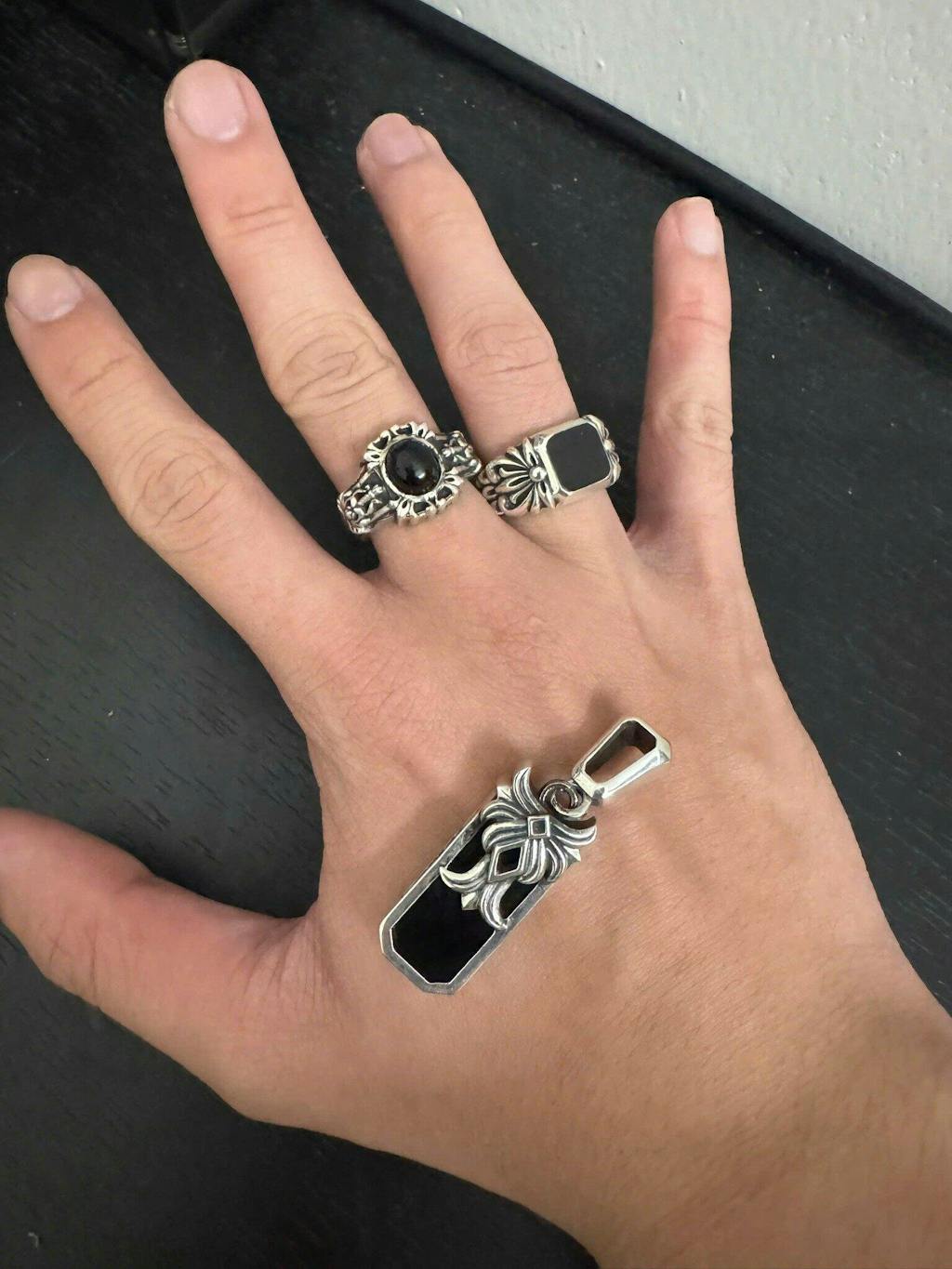 Mặt nhẫn là một chiếc khiên đen với đá onyx, bạc S925 như lớp giáp đã qua thời gian.