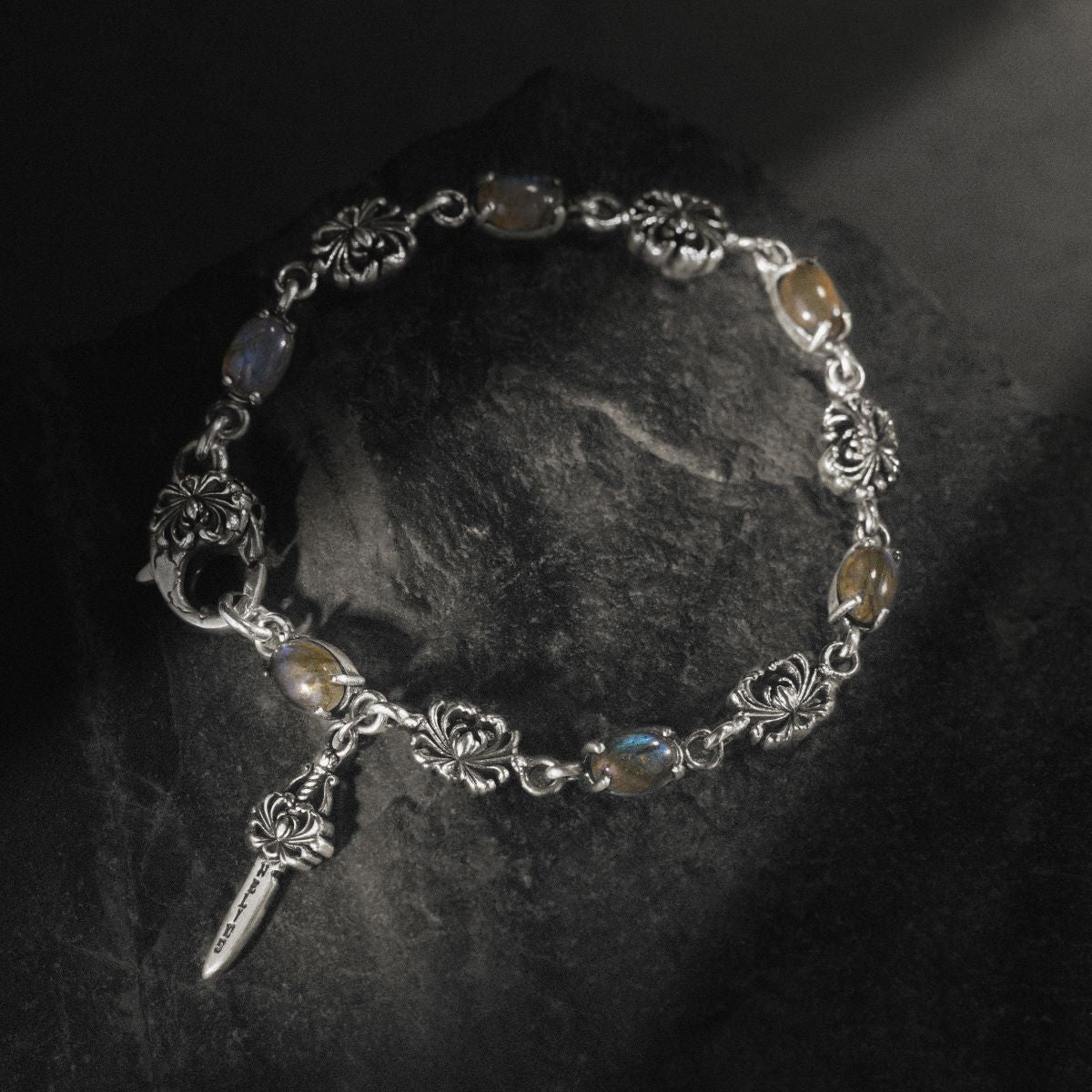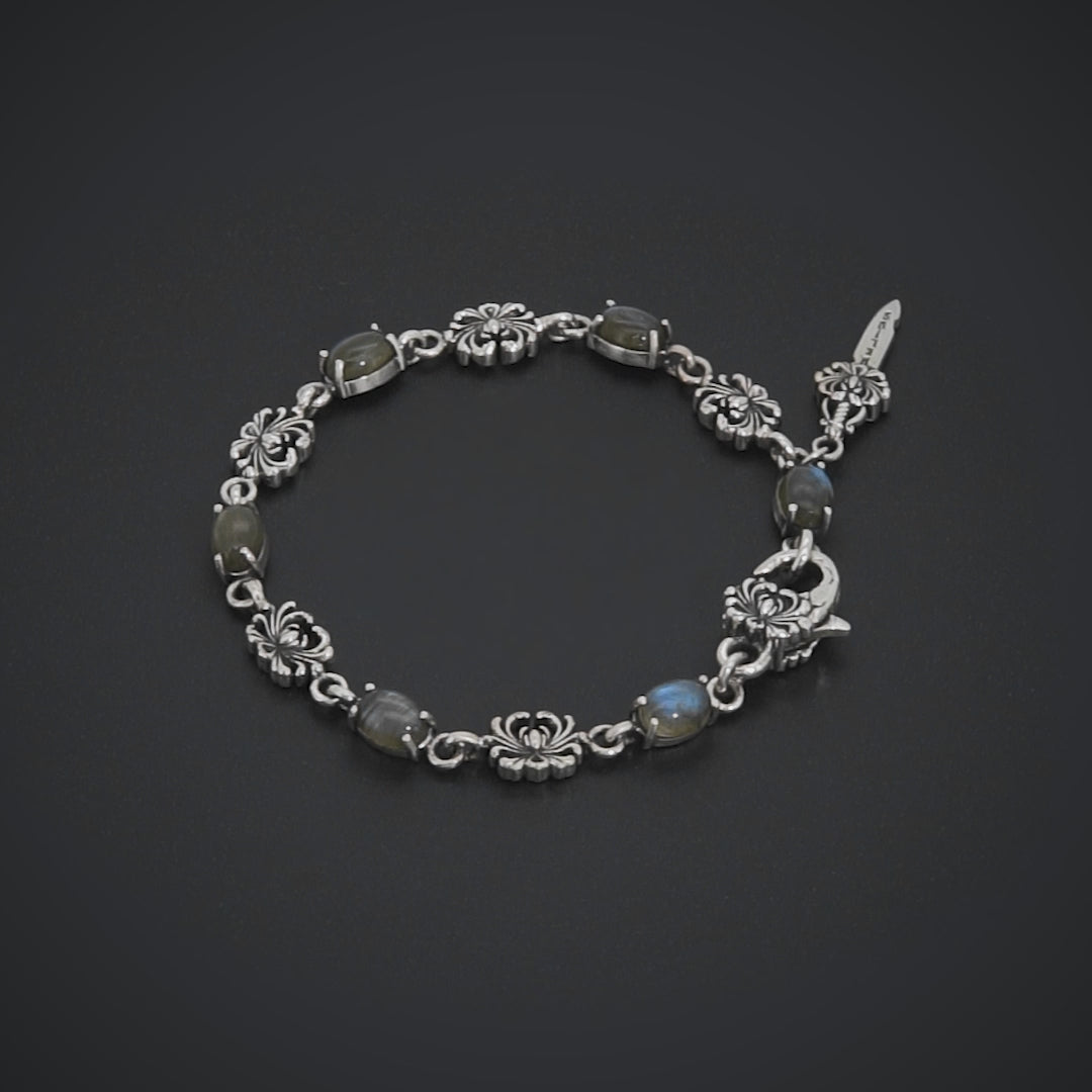 Tâm điểm của thiết kế nằm ở viên đá Labradorite – loại đá huyền bí với ánh ngũ sắc ẩn hiện dưới bề mặt xám tro. Giới đá quý gọi nó là “ánh sáng chiến binh” – thứ ánh sáng chỉ hiện lên khi được xoay chuyển đúng góc, giống như nội lực thật sự chỉ bộc lộ khi trải qua thách thức. Labradorite còn gắn liền với trực giác, khả năng tự chữa lành và sự thức tỉnh cá nhân.