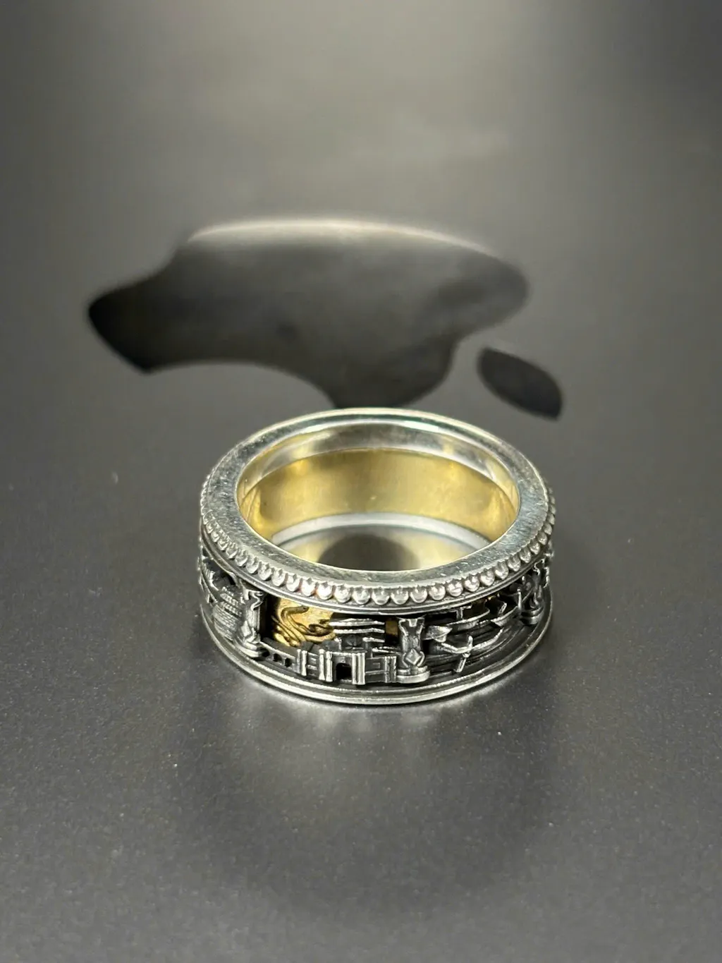 Thân nhẫn chạy như một dải phù điêu: kiến trúc, mái ngói, mây trời, sóng nước, rồng thời Lý, và những cảnh quen thuộc của nhiều vùng đất. Mỗi mảng không đứng riêng lẻ nó nối nhau thành một vòng tròn, như cách ký ức của mình cũng vậy: đi nhiều nơi, gặp nhiều điều, cuối cùng vẫn quay về một chữ “nhà” và lớn hơn là chữ "Đất nước".