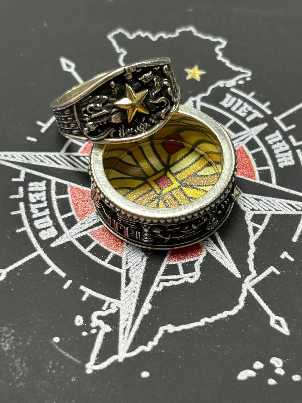 Ở tâm nhẫn là ngôi sao 5 cánh màu vàng nổi bật tượng trưng cho lá quốc kỳ, xung quanh là những biểu tượng đặc trưng mà bất kỳ người dân Việt Nam nào đều biết hoặc đã từng đến. Helios muốn ký ức, hình tượng được giữ lại bằng bạc đi cùng năm tháng.