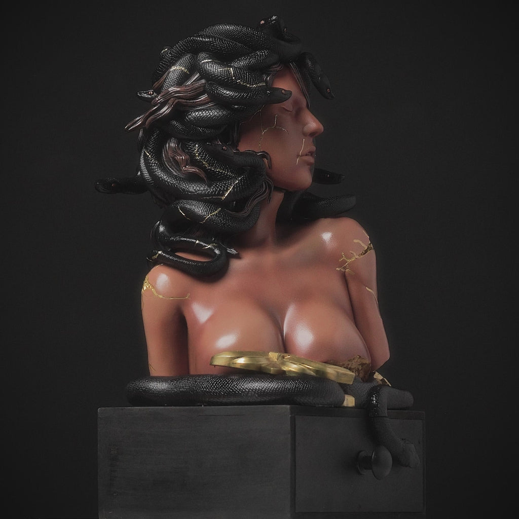 그녀는 바다의 신 포세이돈의 눈에 띄었고, 그는 아테나 신전에서 그녀의 처녀성을 빼앗았습니다. 이 일로 신은 분노하여 그녀를 뱀 머리와 돌로 변하게 하는 저주를 받은 괴물로 만들었습니다.