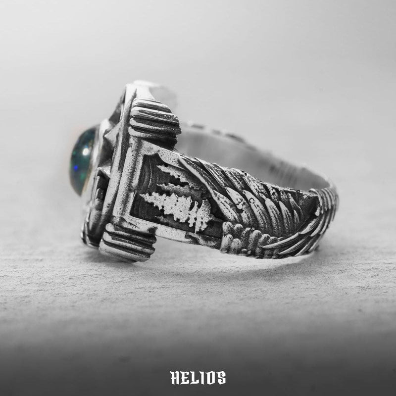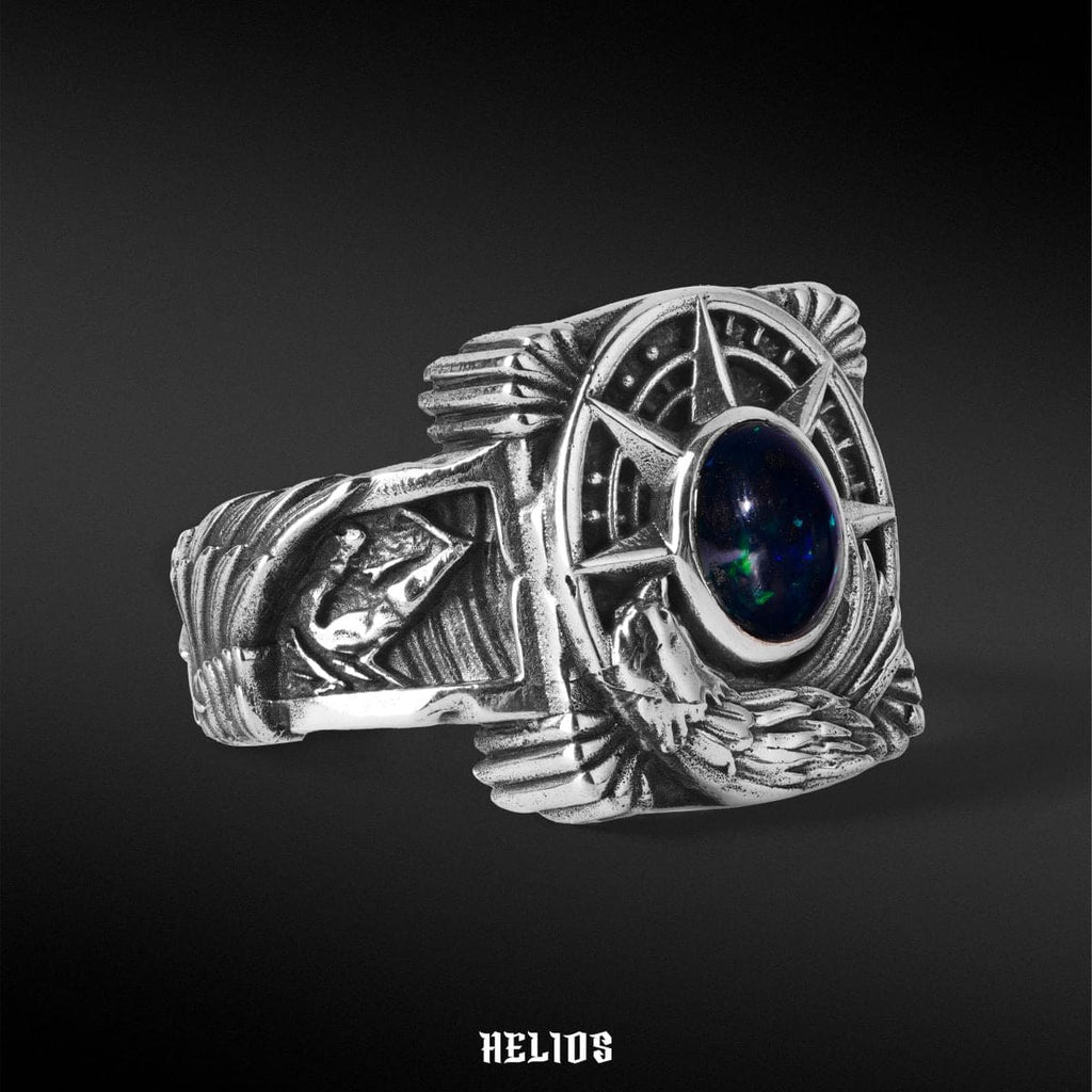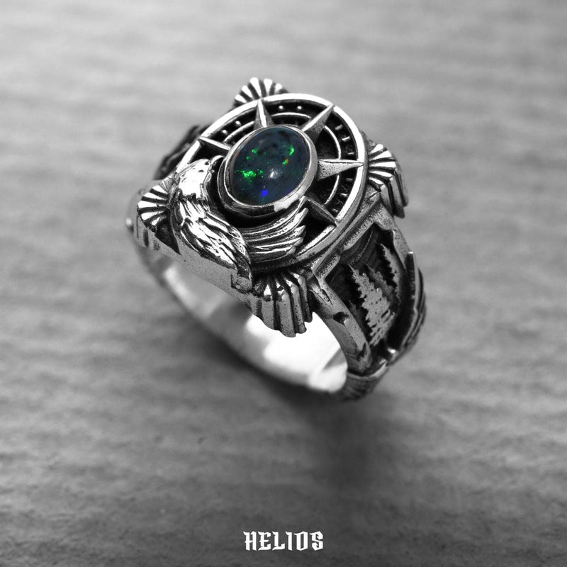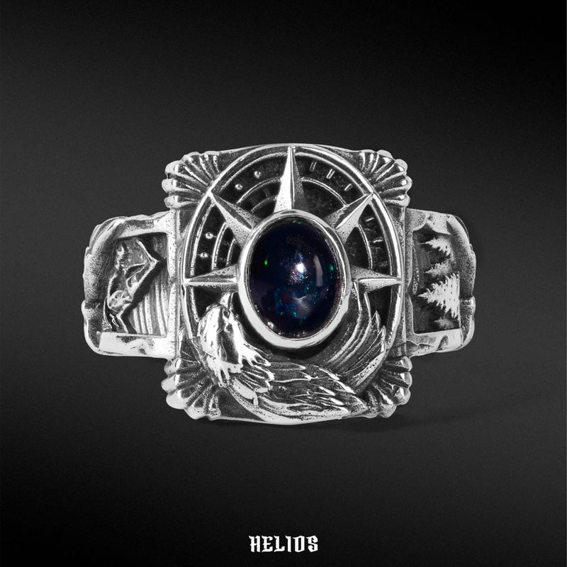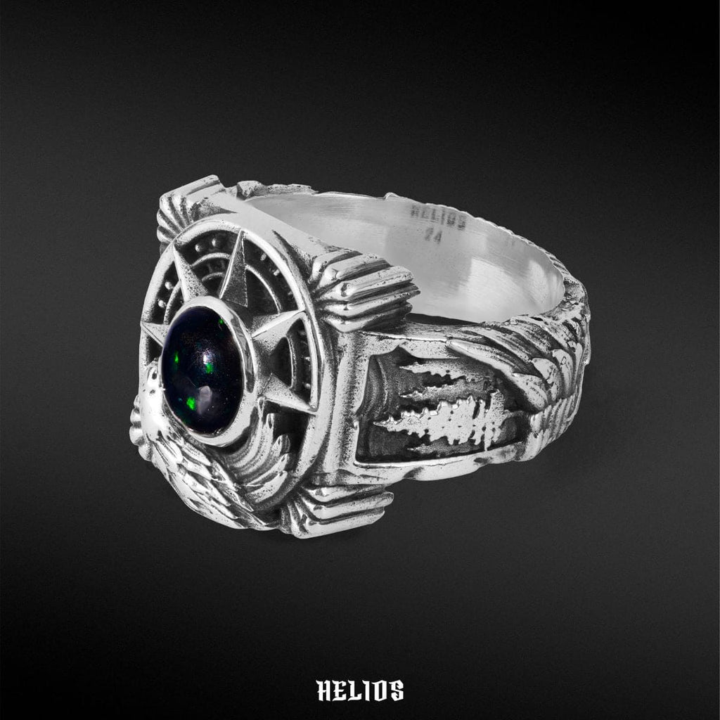 반지에는 나침반이 새겨져 있는데, 독수리가 자랑스럽게 날개를 펼치고 산과 깊은 숲을 날아다니는 모습이 새겨져 있습니다. 반지 양쪽에는 완만한 소나무 언덕과 탐험을 갈망하는 마음을 인도하는 북극성이 새겨져 있습니다.
