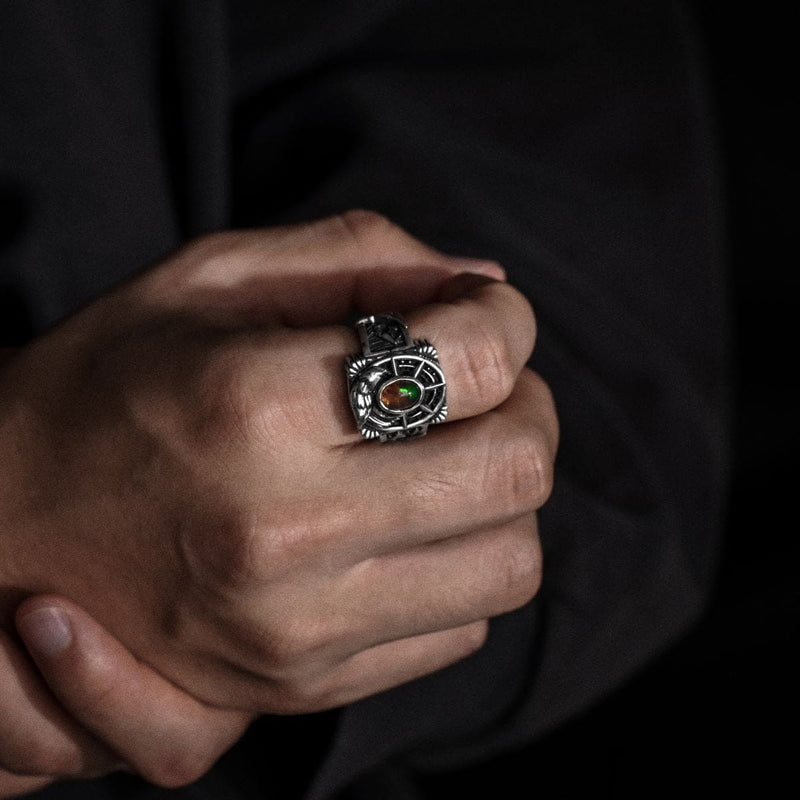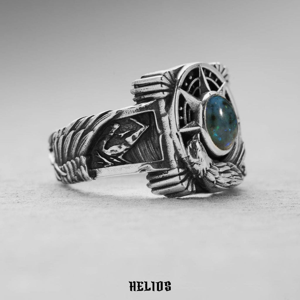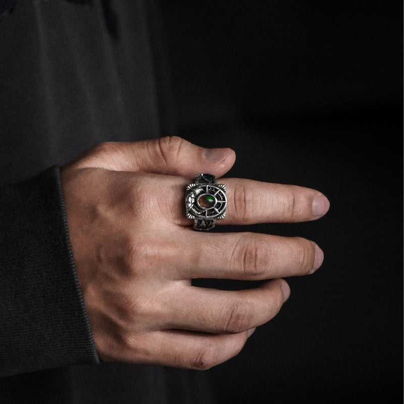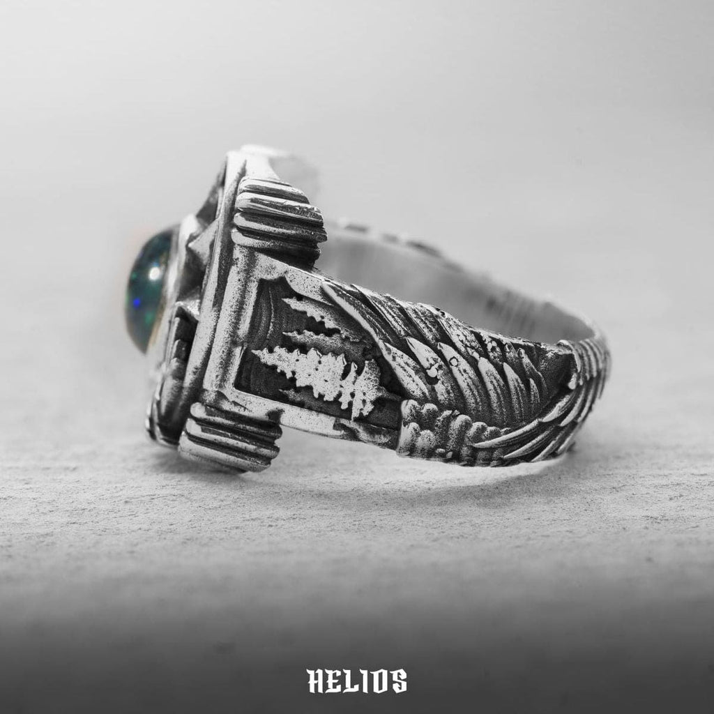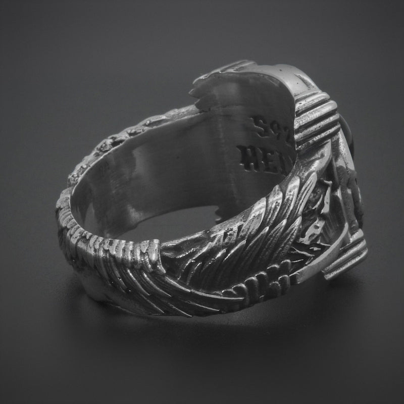 반지에는 나침반이 새겨져 있는데, 독수리가 자랑스럽게 날개를 펼치고 산과 깊은 숲을 날아다니는 모습이 새겨져 있습니다. 반지 양쪽에는 완만한 소나무 언덕과 탐험을 갈망하는 마음을 인도하는 북극성이 새겨져 있습니다.