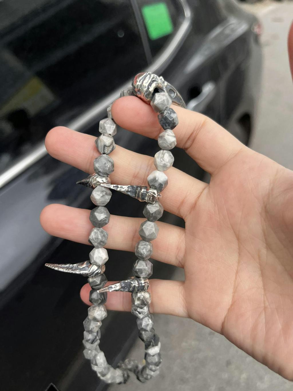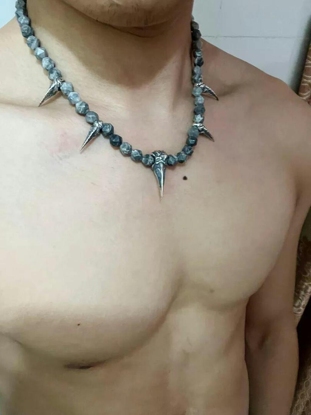 태국산 흑색 도금 은으로 제작되고 맵 재스퍼 원석으로 장식된 이 목걸이는 전체적으로 시원하고 대담하며 독특한 스타일을 자랑하며 기존 목걸이 디자인과는 차별화됩니다.