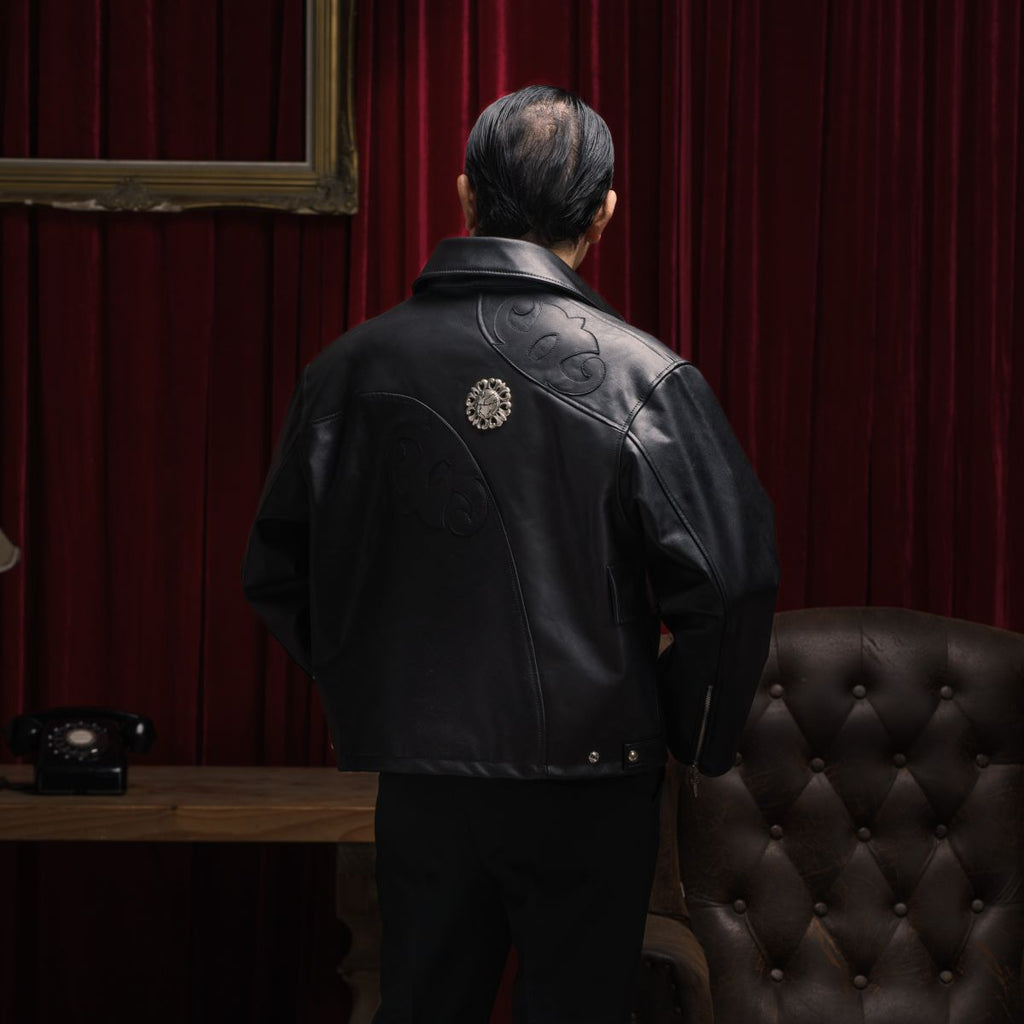 Form áo được phát triển riêng, mang tính độc bản, với kỹ thuật xử lý patching layer da trên lưng phức tạp – đòi hỏi sự tỉ mỉ, mỗi chiếc áo mất 36 tiếng để hoàn thiện. Chất liệu sử dụng da Nappa nguyên miếng dập nổi Sunflower và gần 3 cây bạc S925 cho các chi tiết Signature như cúc áo, khoá kéo Chrysaber.